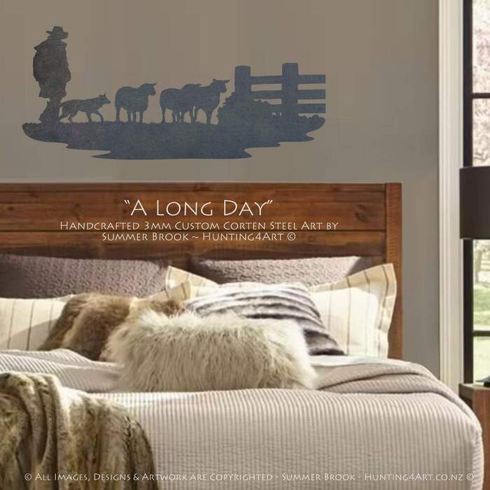 A loyal heading dog helps finish off a long day with his master by his side. This customisable, high quality Corten metal art handcrafted by NZ artist Summer Brook is the perfect way to add a little 'extra something' to your own slice of paradise!