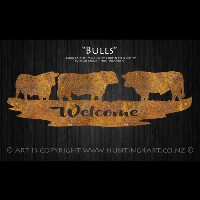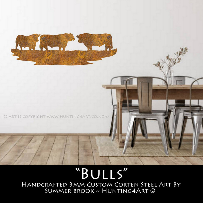 Three handsome bulls looking good in the lush spring grass. This customisable, high quality Corten metal art handcrafted by NZ artist Summer Brook is the perfect way to add a little 'extra something' to your own slice of paradise!