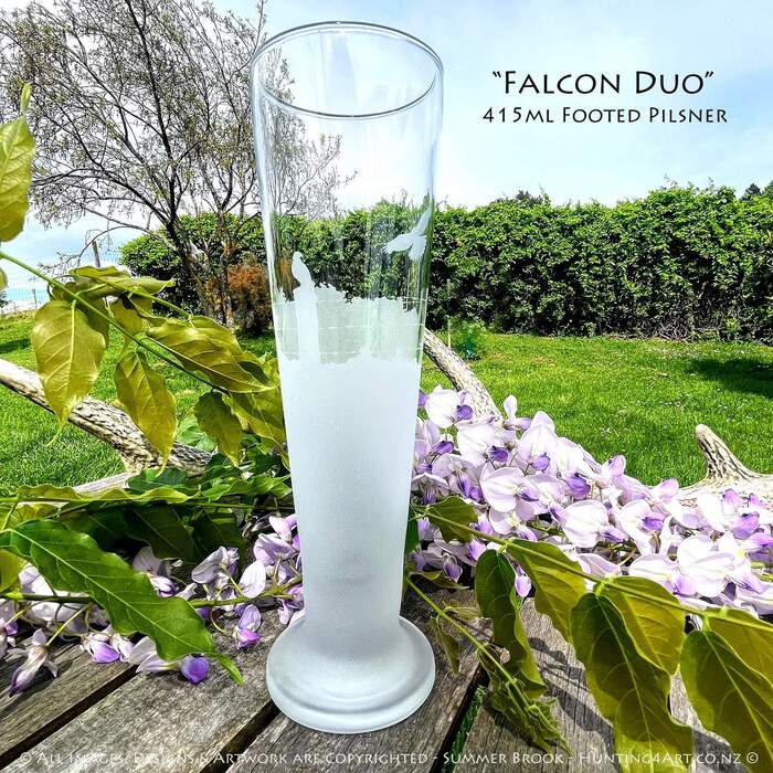 NZ's native falcons, one Karearea makes use of a barbed wire fence to survey their territory while another takes in the view from above. This beautifully handcrafted sandcarved glass art comes in a range of styles including wine glasses, beer mugs, whiskey decanters, tumblers and more!