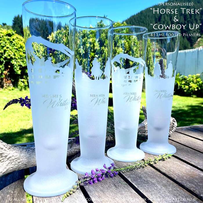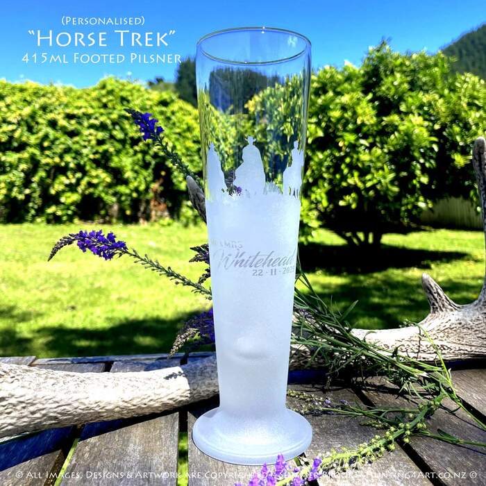 Horses, horseback riders and hills = happiness! This beautifully handcrafted sandcarved glass art comes in a range of styles including wine glasses, beer mugs, whiskey decanters, tumblers and more!