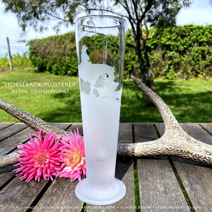 A good team of dogs and a tough horse make for easier work in the hill country of New Zealand. This beautifully handcrafted sandcarved glass art comes in a range of styles including wine glasses, beer mugs, whiskey decanters, tumblers and more!