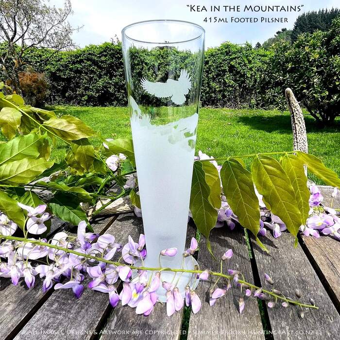 NZ's iconic alpine parrots, the Kea, frolic in the tussock covered mountains of the Southern Alps. This beautifully handcrafted sandcarved glass art comes in a range of styles including wine glasses, beer mugs, whiskey decanters, tumblers and more!