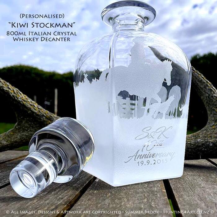 A young NZ farmer on horseback pushes a mob of cattle through the gate with the help of his hard working dogs. This beautifully handcrafted sandcarved glass art comes in a range of styles including wine glasses, beer mugs, whiskey decanters, tumblers and more!
