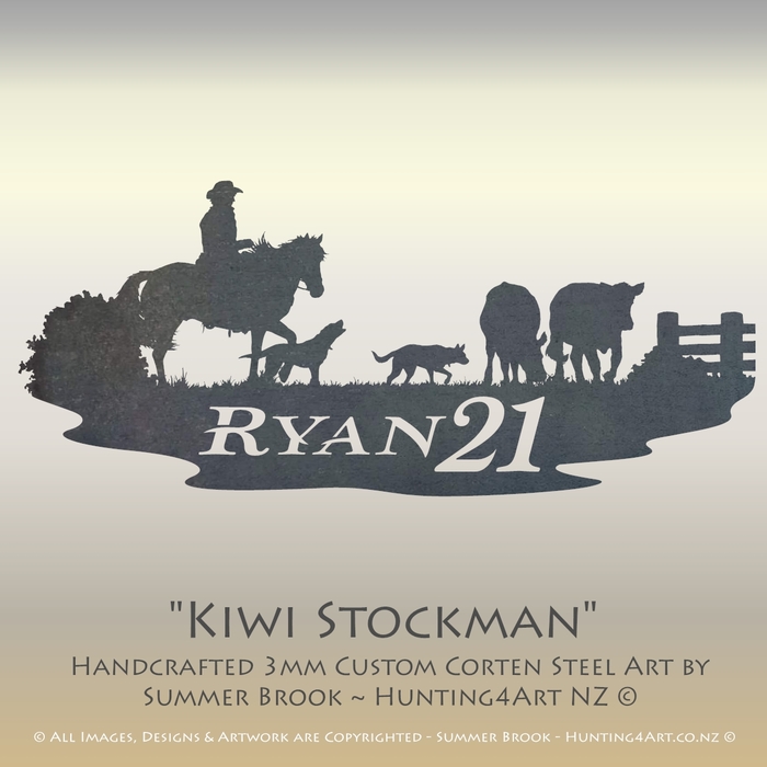 A young farmer on horseback pushes a mob of cattle through the gate with the help of his hard working dogs. This customisable, high quality Corten metal art handcrafted by NZ artist Summer Brook is the perfect way to add a little 'extra something' to your own slice of paradise!