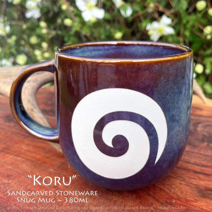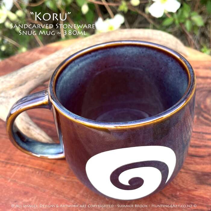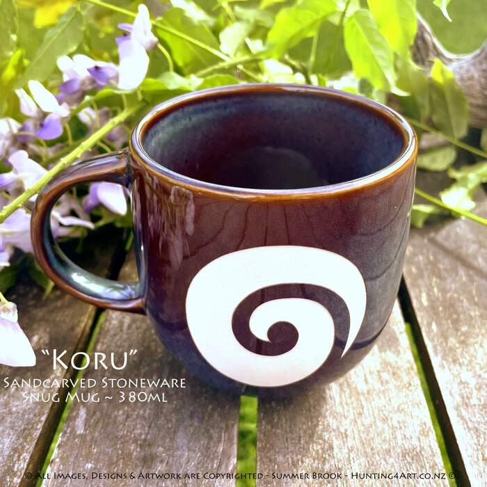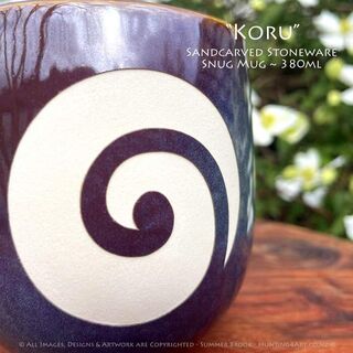 A single Koru. Symbolising new life, new beginnings, growth, peace and harmony. This beautifully crafted hand sandcarved stoneware mug is a great way to start your day off right and remember that every day is a blessing and a chance to start fresh!