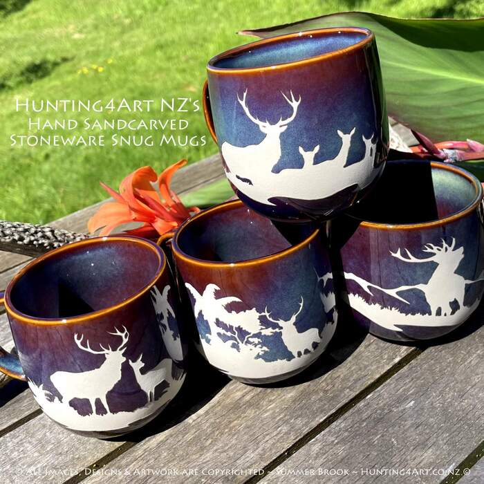 Hunting4Art's beautiful sandcarved stoneware 'Snug Mug' range is of the highest quality and engraved with Summer Brook's famous artworks! Each piece is sand carved through the glaze layer, exposing the creamy white stoneware beneath. A truly sensory experience as you trace the design with your fingertips while enjoying your favourite hot beverage.....FYI - It's coffee in our house!