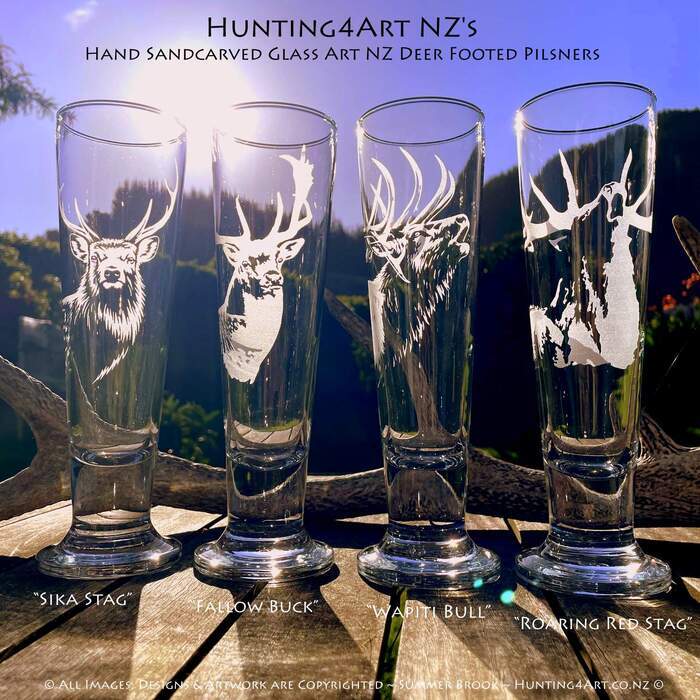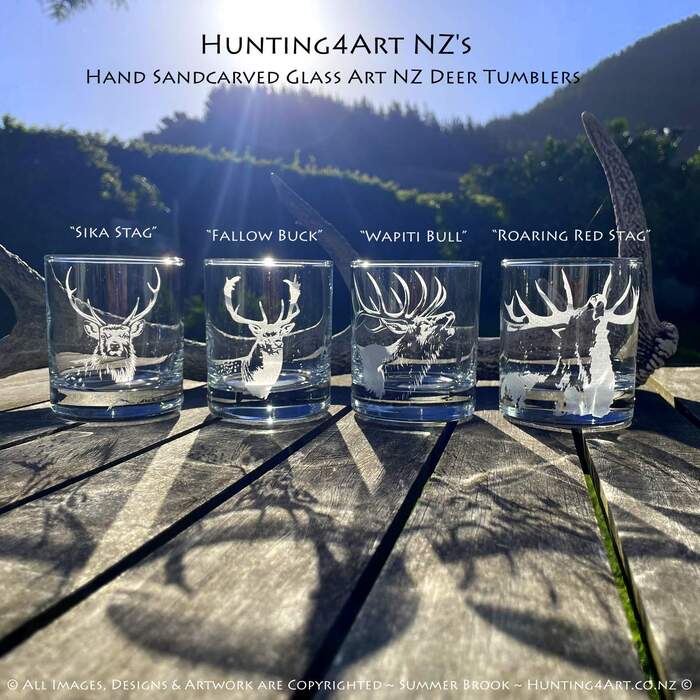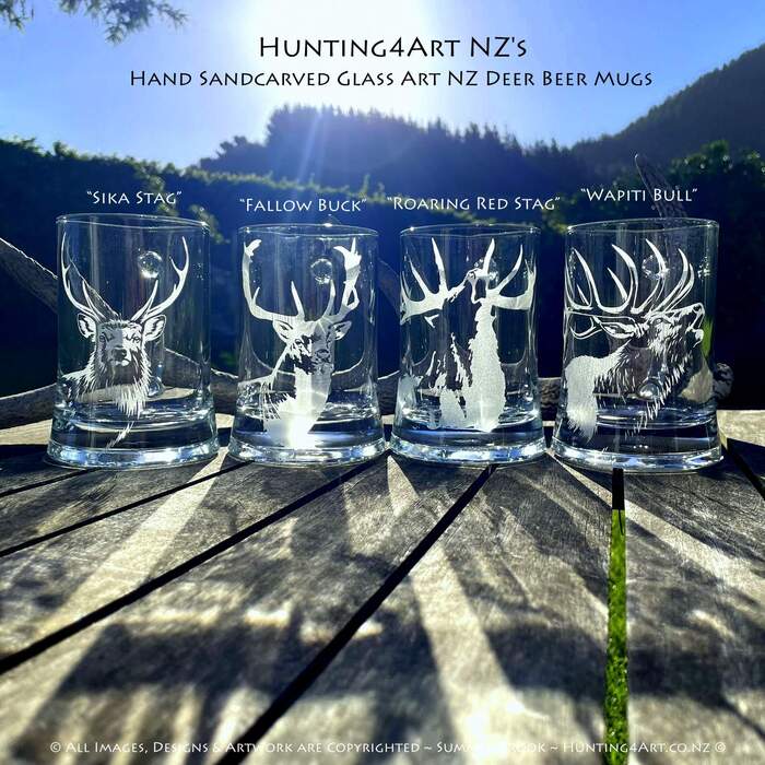 A stunning selection of New Zealand's iconic deer species feature in this detailed and realistic mix of four different designs ~ Wapiti Bull, Sika Stag, Red Stag and Fallow Buck. These beautifully handcrafted sandcarved glass art sets come in a range of styles including wine glasses, beer mugs, shot glasses, tumblers and more!