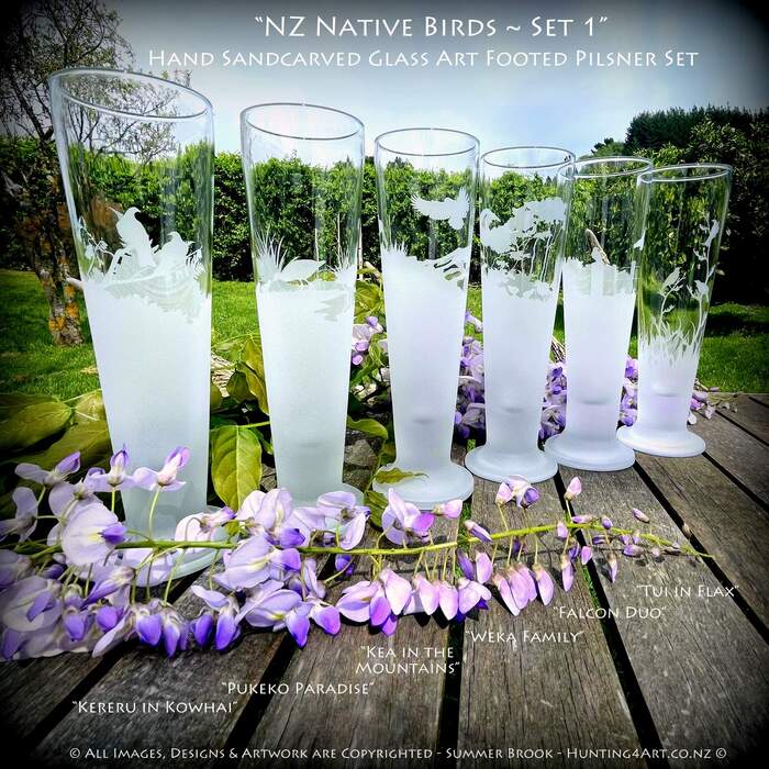 ★★★★★NZ Native Birds" Sandcarved Glass Art 6 Piece SetsAbsolutely Love these Glasses I've been lucky enough to have been given these as gifts individually and have also brought a set of 6, I feel so special and I'm sure my wine tastes better out of these. Glad that I'm also helping a Mother stay at home with her babies as I was privileged to do. Keep up the amazing work. Thank you