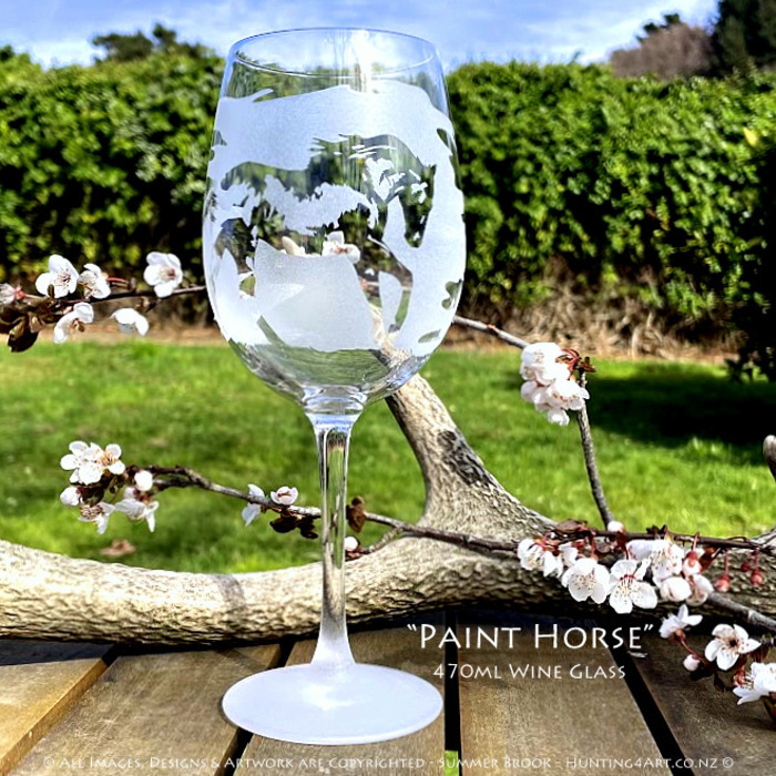 An absolute beauty, this graceful Paint horse is a true work of art. This beautifully handcrafted sandcarved glass art comes in a range of styles including wine glasses, beer mugs, whiskey decanters, tumblers and more!