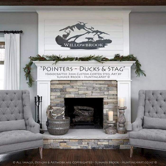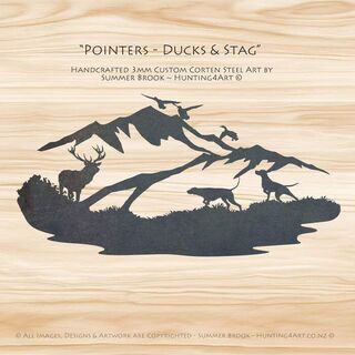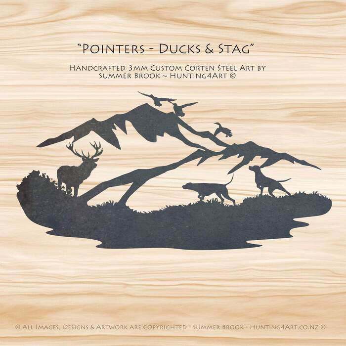 Two well-trained gun dogs showing how it's done by pointing out mallard ducks and a mighty red stag! This customisable, high quality Corten metal art handcrafted by NZ artist Summer Brook is the perfect way to add a little 'extra something' to your own slice of paradise!