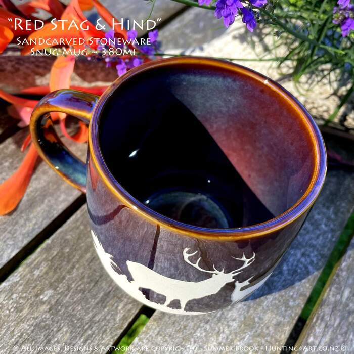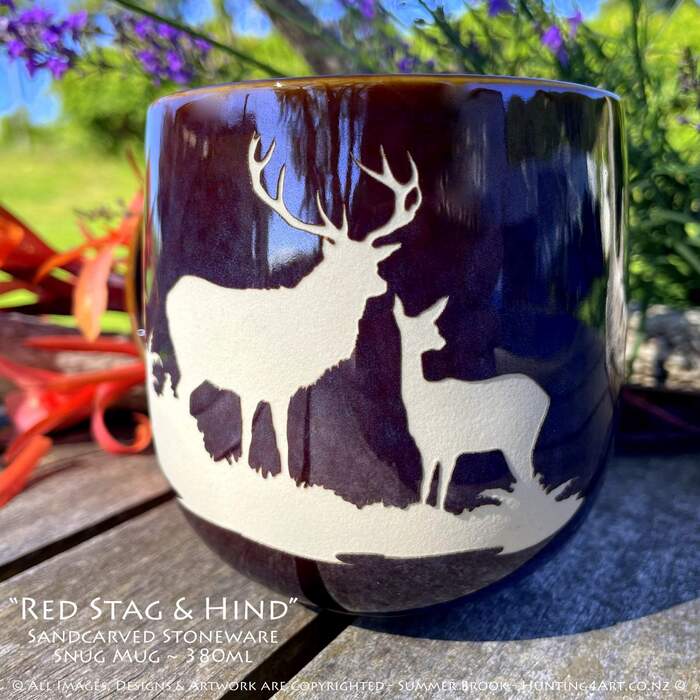 A magnificent NZ Red stag & hind stand proud. This beautifully crafted hand sandcarved stoneware mug is a great way to start your day off right!