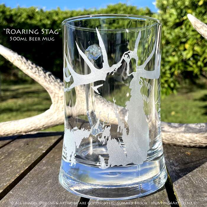 NZ's mighty red stag in full roar! This beautifully handcrafted sandcarved glass art comes in a range of styles including wine glasses, beer mugs, whiskey decanters, tumblers and more!