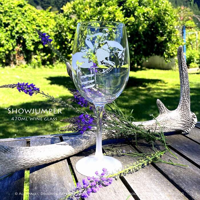 Teamwork at its finest! A determined horse and rider glide effortlessly over the jump. This beautifully handcrafted sandcarved glass art comes in a range of styles including wine glasses, beer mugs, whiskey decanters, tumblers and more!