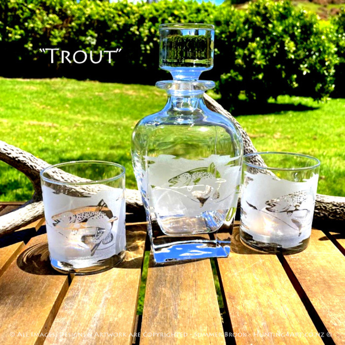 A hungry NZ trout about to strike at the 'sneaky' fly! This beautifully handcrafted sandcarved glass art comes in a range of styles including wine glasses, beer mugs, whiskey decanters, tumblers and more!