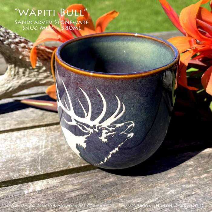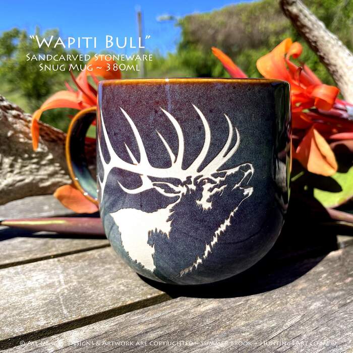 NZ's mighty Wapiti bull elk at full noise! This beautifully crafted hand sandcarved stoneware mug is a great way to start your day off right!