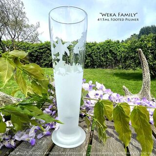 A family of cheeky Weka are happy to play in their own NZ native bush oasis. This beautifully handcrafted sandcarved glass art comes in a range of styles including wine glasses, beer mugs, whiskey decanters, tumblers and more!